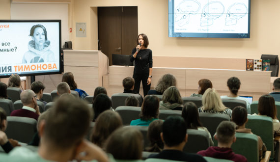 Программа началась с лекции «Почему все такие умные?» для всех желающих во Владимирском государственном университете имени Александра Григорьевича и Николая Григорьевича Столетовых. Евгения Тимонова разъяснила, почему так сложно измерить уровень интеллекта, и рассказала о том, как развивался мозг у наших предков и некоторых животных несколько миллионов лет назад.