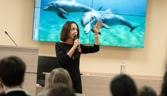 «Дельфин — это парнокопытная хищная свинья, эволюционировавшая за последние 50 миллионов лет. Был такой зверёк, назывался он потицеп. Выглядел он как свинья, но только хищная, с длинной мордочкой и копытцами, обитал на берегу древних водоёмов и любил рыбу. Такая любовь увела его в воду, и в итоге потицеп стал предком дельфинов и китов. Все китообразные и дельфины умные в том числе по той причине, что они снова вернулись в воду с суши и встретились с совершенно непривычной средой, в которой для совершения движения и ориентации в пространстве нужно было развивать абсолютно новые двигательные навыки», — поделилась спикер.