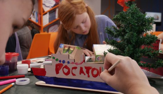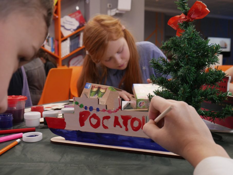 Начался вечер с мастер-класса по дизайну атомных ледоколов. Из фильма «Атомный ледокольный флот» маленькие зрители узнали, как российские инженеры проектируют современные ледоколы, как их строят и зачем они нужны. А затем приступили к раскрашиванию деревянных заготовок. Забава Устинова, инженер-конструктор ПАО «ЦКБ Айсберг», которая принимает участие в проектировании ледоколов, похвалила юных художников за интересный дизайн.