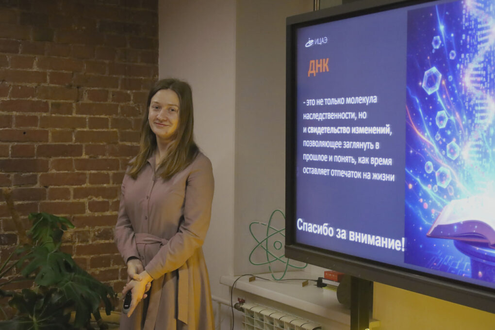 Елизавета Фонова (к.м.н., НИИ медицинской генетики Томского НИМЦ) рассказала про ДНК, представив время в качестве материала генетики, а также затронула тему возможности восстановления мамонтов и лютоволков.