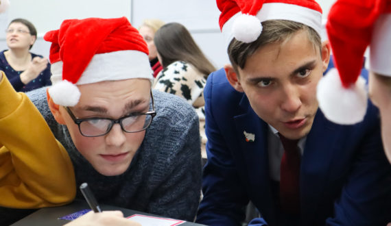 Последняя игра года прошла в новогодней атмосфере. Ощущение праздника создавали тематические костюмы и специальный дизайн игры, новогодняя музыка и открытки, на которых участники писали поздравления друг другу. А ещё большинство вопросов было связано с Новым годом.