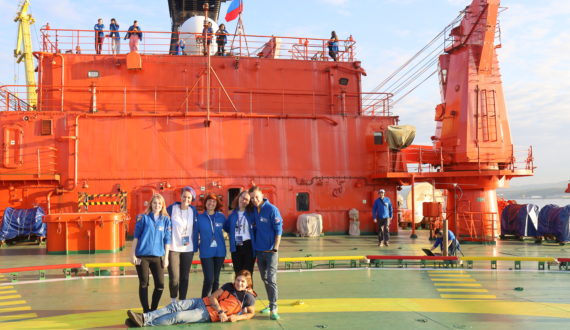 Из Мурманска на Северный полюс отправились более 80 школьников и студентов со всей России в возрасте от 12 до 23 лет. Это победители Всероссийского детского интеллектуального конкурса «Ледокол знаний», организованного сетью Информационных центров по атомной энергии в рамках празднования 75-летия атомной промышленности, победители Турнира молодых профессионалов (ТЕМП) Госкорпорации «Росатом», участники общероссийской общественно-государственной детско-юношеской организации «Российское движение школьников», участники Всероссийского конкурса «Большая перемена», других олимпиад и конкурсов.