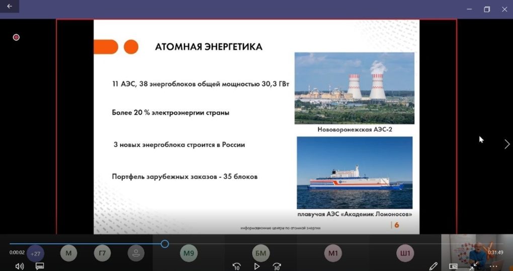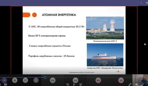 «Ни для кого не секрет, что огромное значение в деятельности Госкорпорации «Росатом» отведено атомной энергетике. В настоящее время в России действуют 11 АЭС, а это 38 энергоблоков общей мощностью 30,3 ГВт, что составляет более 20% электроэнергии страны. Таким образом, примерно каждая пятая лампочка в Российской Федерации горит от энергии, выработанной атомными станциями», – сообщил спикер.