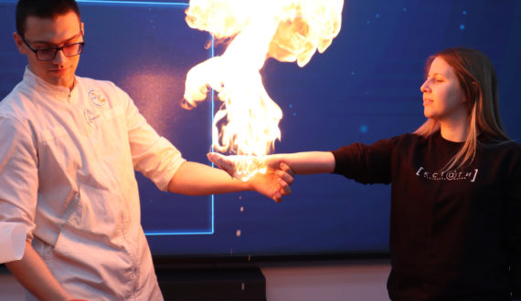 Евгений Недоступ, учащийся магистратуры по специальности «Большие данные и нейросети», и Эвелина Кондратович, учащаяся бакалавриата по специальности «Химические технологии», рассказали участникам шоу, какой газ поддерживает горение, из чего состоят деньги и почему они могут гореть и не сгорать, какое пламя можно без вреда для себя держать в руках и как правильно тушить огонь.