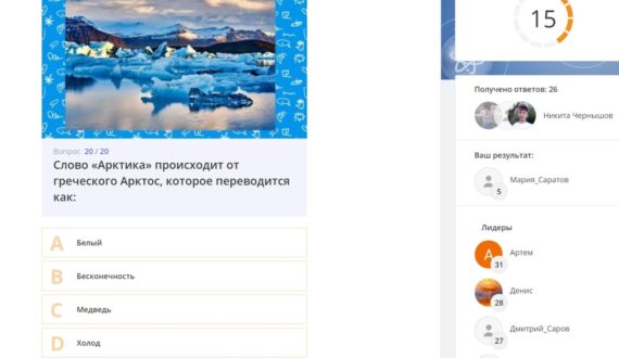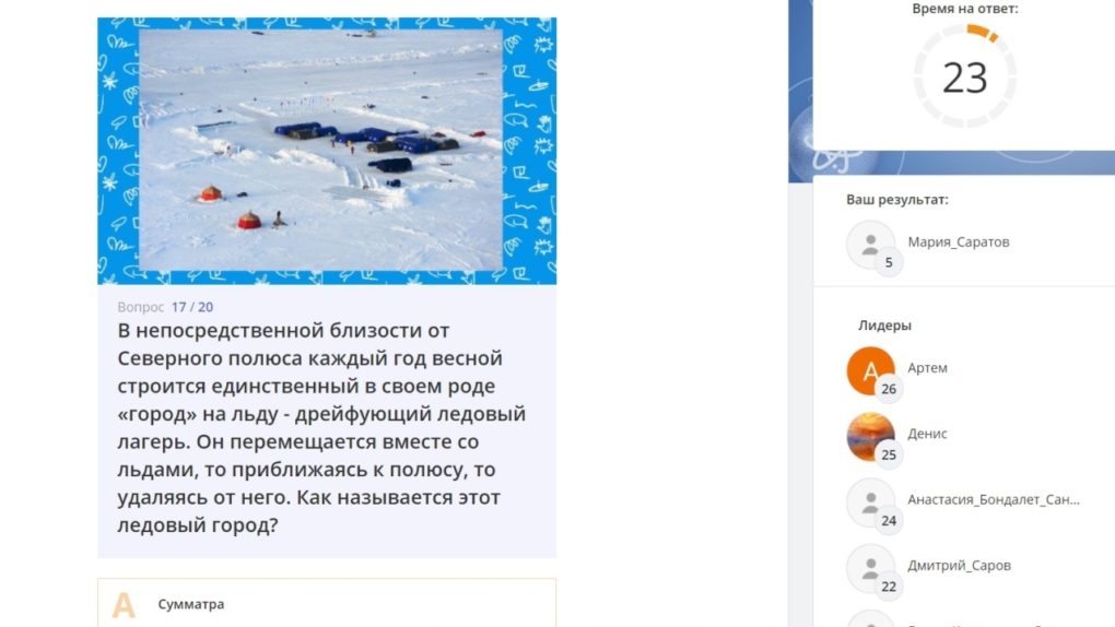 Во время игры участники узнали, что название «Арктика» происходит от греческого «арктос», которое переводится как «медведь». Кроме того, игрокам пришлось вспомнить, как называется дрейфующий ледовый лагерь на льду, который строится каждый год весной недалеко от Северного полюса, и как звали первого русского живописца, изобразившего на своих полотнах пейзажи Арктики. Его называли «художником вечных льдов», «русским Нансеном» и «поэтом Севера», и он сам не раз участвовал в северных экспедициях.