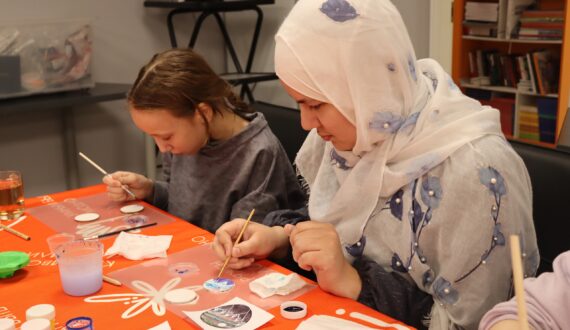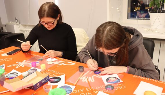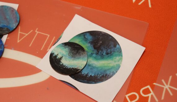С разноцветных красок и интересных фактов о северном сиянии стартовал «ИЦАЭ OPEN: в поисках северного сияния». Гости посмотрели научно-популярный фильм, в котором на самые распространённые вопросы о северном сиянии отвечал Ярослав Сахаров, заведующий лабораторией геофизических наблюдений Полярного геофизического института. А чтобы задействовать максимальное количество рецепторов, не только зрительных и слуховых, участникам было предложено передать своё видение северного сияния в процессе рисование этого атмосферного физического явления на значках с помощью красок, кистей и полученных знаний о возможных его цветах и оттенках.