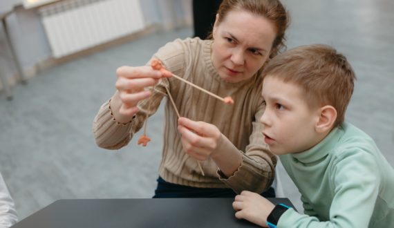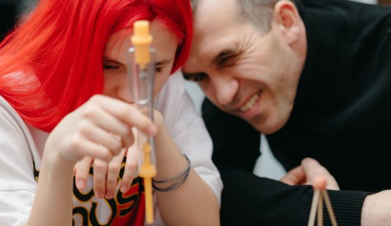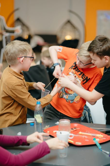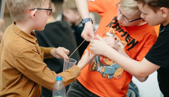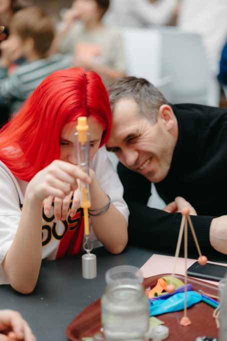 Вначале Константин Колесников познакомил гостей с силой тяжести. Участники искали центр тяжести, используя подручные предметы, и устанавливали центр тяжести ниже точки опоры.