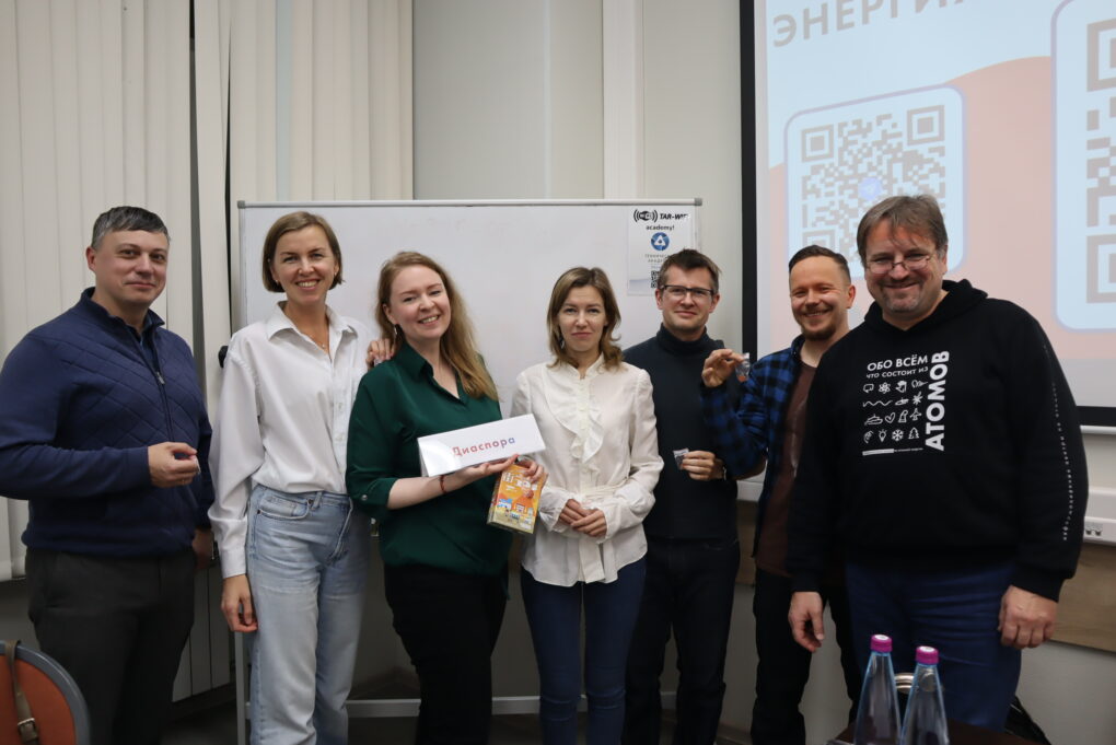 Завершился вечер «ИЦАЭ OPEN: энергия игры» встречей клуба знатоков «Квантовые совы». Команды активно обсуждали различные темы, отвечали на сложные, но интересные вопросы и радовались, когда их ответы были правильными. Игрокам приходилось вспоминать всё: от героев сказок до единиц измерения. Сергей Абрамов провёл игру, давая комментарии о том, на что стоит обращать внимание, какие «зацепки» можно найти в вопросах, и давал ценные советы. Победителем игры стала команда «Диаспора», набрав 11 баллов.