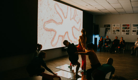 Завершился вечер танцевальным перформансом с зеркалами «В отражении» от преподавателя студии современного танца Марии Власовой, в ходе которого гости могли наблюдать, как преломление света отражается на движениях и на всём танце.