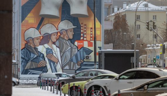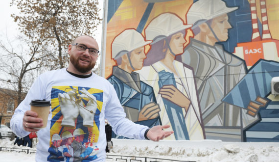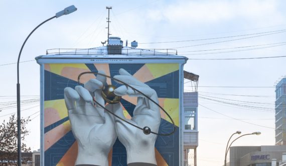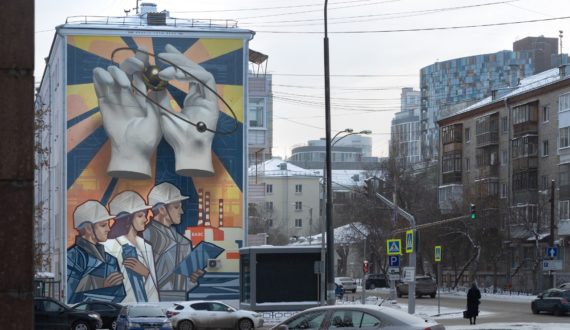 Работа величиной с пятиэтажный дом называется «Рассвет новой эры» и объединяет две техники: монументализм и 3D-живопись. Мурал изображает три фигуры атомщиков на фоне здания Белоярской АЭС, а над ними руки, которые бережно держат ядро атома.