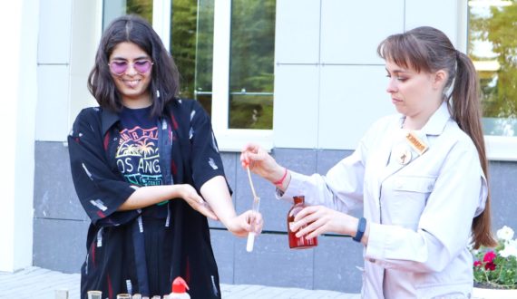 Волжский бриз и согревающее солнце позволили раскрыться химическому чемоданчику, скрывающему в себе разнообразные опыты: создание искусственной крови, газовый вихрь, «слоновая паста» и многое другое. Посетители также приняли непосредственное участие в проведении каждого опыта, попробовав себя в роли учёного химика.