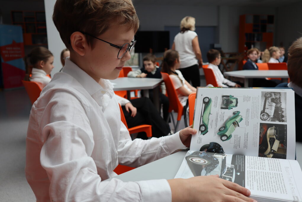 В увлекательное путешествие в мир автопрома предложил отправиться Даниил Малохвей. Он презентовал энциклопедию «Большая книга об автомобилях». Она рассказывает о масштабном исследовании мира автомобилей: от первых карет с двигателем внутреннего сгорания до современных автокаров. Даниил поделился интересным фактом: «Первые чертежи автомобиля принадлежали Леонардо да Винчи. Это был самодвижущийся экипаж, работающий на пружинном механизме. Создателем автомобиля с двигателем внутреннего сгорания считается немецкий конструктор Карл Бенц, который получил патент на свой трехколесный экипаж в 1886 году».