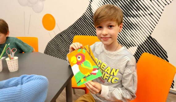 С помощью цветного песка гости создали яркие картины, на которых изображены попугай, черепаха и игрушечный мишка.