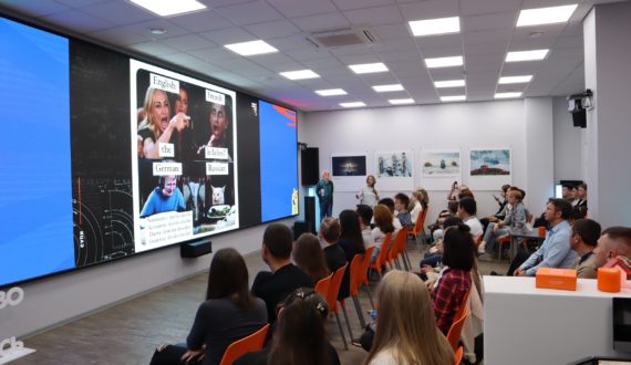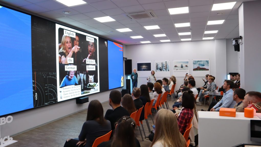 Вечер продолжился разговором о лингвистике. О том, как лучше понять науку о языках с помощью мемов, рассказала кандидат филологических наук из Красноярска Анна Трапезникова, доцент кафедры коррекционной педагогики Красноярского государственного педагогического университета им. В. П. Астафьева.