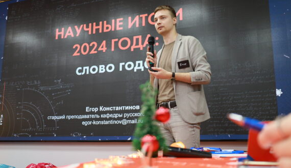 Вечер начался с подведения научных итогов года. Филолог Егор Константинов рассказал о том, какое слово года выбрали эксперты. И это слово «вайб» — атмосфера, эмоциональное состояние или общее чувство, которое исходит от чего-либо или кого-либо.