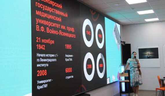 Телемост начался с выступления Елизаветы Бреховой, ординатора Красноярского государственного медицинского университета. Она рассказала зрителям о том, насколько разнообразной может быть профессия врача.