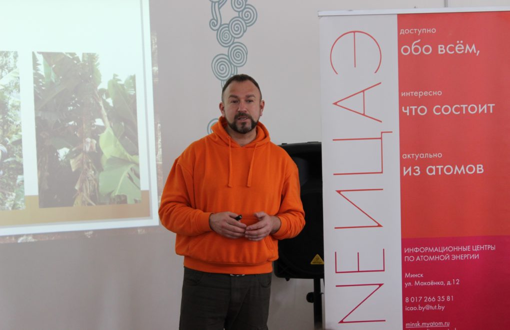 Арам Аветисов, канд. мед. наук, доцент, заведующий кафедрой радиационной медицины и экологии Белорусского государственного медицинского университета, рассказал, что практически все сорта бананов являются радиоактивными. Они содержат калий и его изотоп калий-40. Этот элемент есть также в петрушке, свекле, капусте, картофеле и сухофруктах. Но под подозрение попали именно бананы. Физики-ядерщики даже придумали такое понятие, как «банановый эквивалент» — это количество радиоактивных изотопов, которые попадают в организм при съедании одного банана. «Средний банан весом 150 г содержит около 0,42 г калия, из которого радиоактивного всего 0,042 мг. Доза от одного съеденного банана равна 0,1 мкЗв., в тоже время доза облучения, получаемая нами при рентгеновском снимке зуба — 5 мкЗв.» — рассказал Арам Рубенович. Также спикер объяснил, какие дозы радиации считаются опасными для человека и где в повседневной жизни мы можем столкнуться с источниками ионизирующего излучения. «Фоновая радиация сопровождает нас в течение всей жизни и является такой же естественной частью окружающей среды, как воздух или вода. Человек человеку — источник облучения. Ваш сосед — источник облучения для Вас» — отметил спикер.