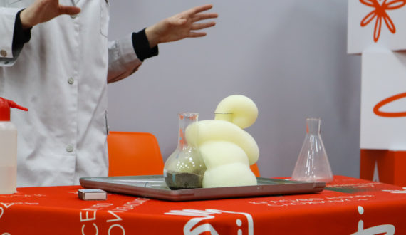 Научный вечер продолжился серией эффектных экспериментов. Каждый гость Инфоцентра смог увидеть красоту химии и доказать, что этой науке неведомы обычные алгоритмы смешения красок: два бесцветных вещества могут при взаимодействии дать и жёлтый, и малиновый, и даже чёрный цвет. Почему знаменитые «Подсолнухи» Ван Гога могут позеленеть и как Казанова почти сбежал из тюрьмы, показали с помощью реакций участники химического шоу.