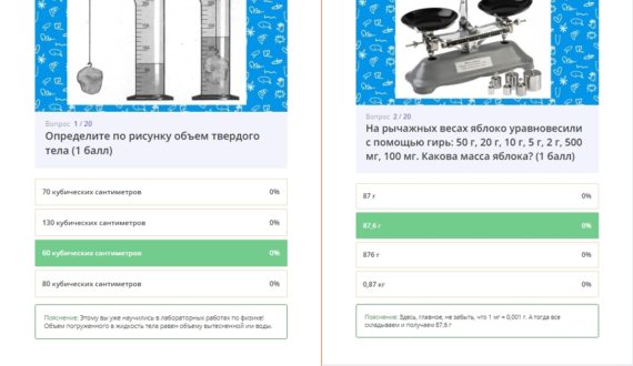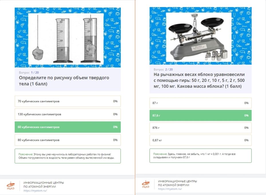 Игроки, в частности, должны были по заданному рисунку определить объём твёрдого тела, сообразить, какой вид силы трения действует на санки, когда они скатываются с горы, ответить, с какой целью на стыках между рельсами делают небольшие промежутки и какой физический процесс происходит со льдом, когда он оказывается в тёплом помещении.