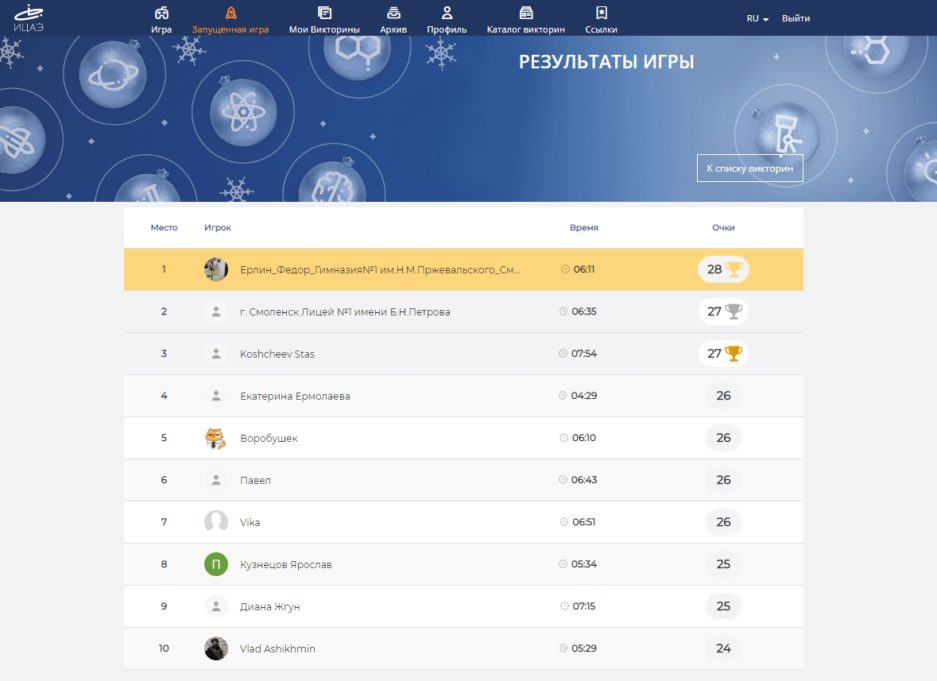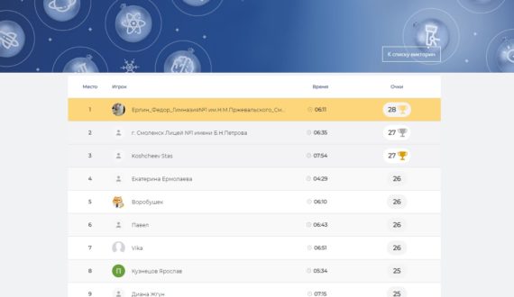 Победителем онлайн-квиза «Атомный зачёт: физики будущего» стал Фёдор Ерлин из гимназии №1 им. Н.М. Пржевальского.