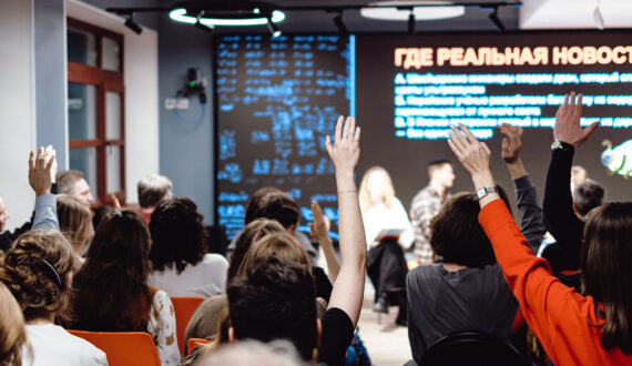 Вечер начался с интерактива «Найди фейк»: зрителям предложили угадать настоящую научную новость среди двух выдуманных заголовков. Правильным ответом оказался первый в мире деревянный спутник, построенный японскими инженерами без единого гвоздя по традиционной технологии.
