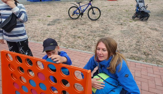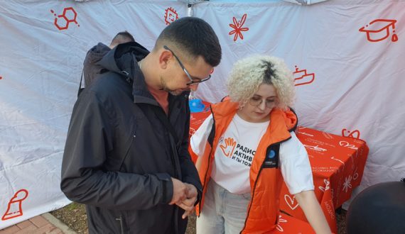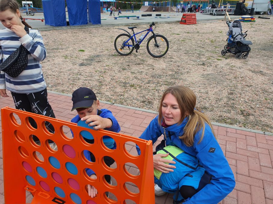 А рядом с шатром можно было поиграть в подвижные фирменные игры сети ИЦАЭ: гигантскую «Физическую дженгу» и «Молекулярный кольцеброс», где участникам нужно накинуть кольца на определенные элементы, чтобы получить формулу вещества, используемого в атомной отрасли.
