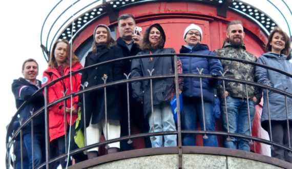 Путешественники вначале отправились поселок Заливино, где совсем недавно открылся после реставрации маяк Риндерорта (Музей Мирового океана). Уже в автобусе началось активное общение, разговоры о науке и интересных историях из жизни каждого. Участники команды Денис Елин, Артем Назаров, Сергей Решин и Дмитрий Горобец показывали Елене Калининград и рассказывали занимательные факты о городе.