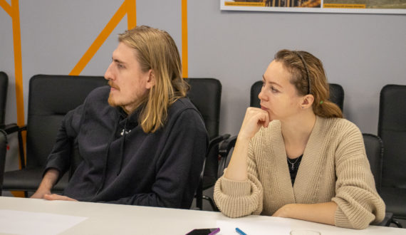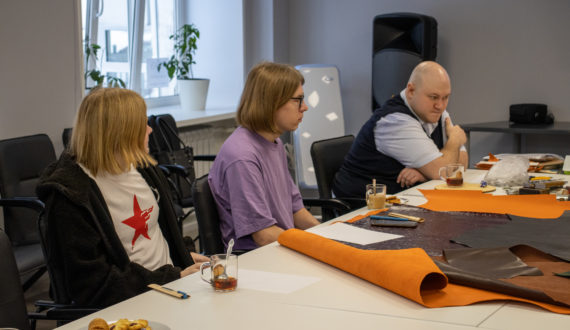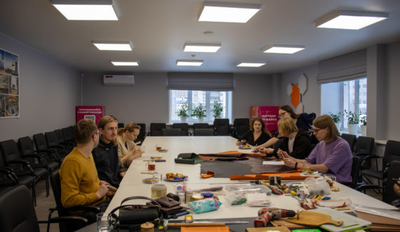 В продолжении встречи её участники смогли погрузиться в творческий процесс и под руководством мастера Сергея Даниленко поработать с натуральной кожей. На примере нескольких образцов они оценили, как выглядят и чем отличаются между собой кожи разных животных и разных типов обработки.
