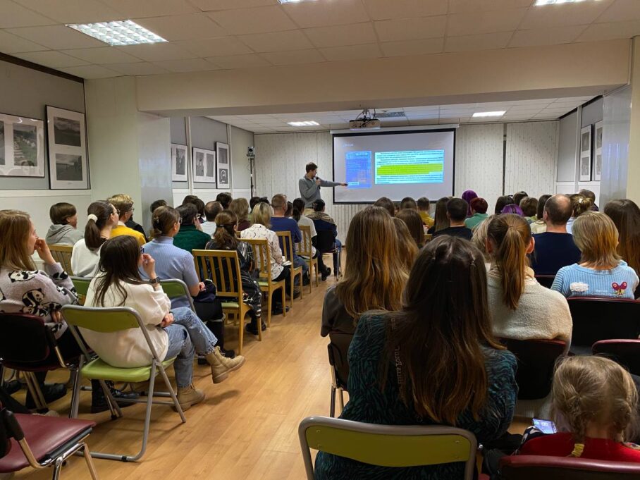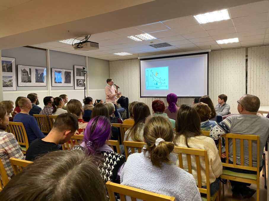 Сначала посетители ближе познакомились с химией благодаря мемам, которые подготовил Иван Головачев, кандидат химических наук, сотрудник АО «ПФ «СКБ Контур», преподаватель УрФУ, победитель и модератор шоу «10 шуток о науке». Например, слушатели узнали, что pH, который часто фигурирует на различных упаковках косметических средств — это водородный показатель среды, или показатель кислотности. Если pH равен 7 — то речь идёт о нейтральной среде, если показатель меньше — среда кислая, а больше — щелочная. Такой идеальный баланс учёный сравнил с философией персонажа Танос из киновселенной Marvel.