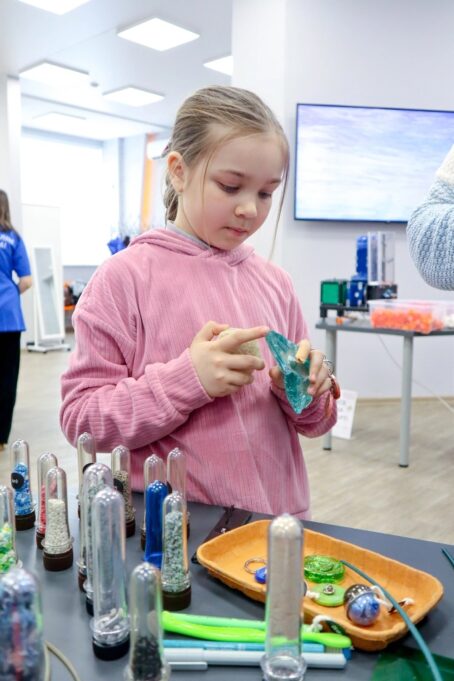 В Музее переработки участники увидели различные предметы, которые можно создать из, казалось бы, обычного «мусора». Из пластиковой бутылки можно сделать синтетическую нить, упаковку для бахил, синтепон, и даже преформу – заготовку для новой бутылки. Участники квеста обратили внимание на стеклянные игрушки – зелёного крокодила Гену и коричневого Чебурашку, сделанных из стеклянной крошки в полимеризаторе.