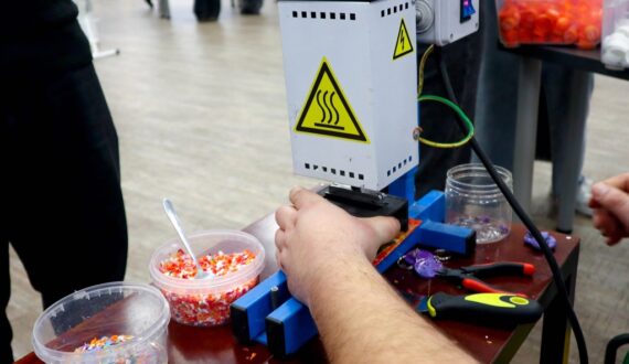 Отдельная станция Экоквеста – мастер-класс по переработке пластика. Под контролем ведущих участники перерабатывали пластик в условиях, близких к промышленным. С помощью шредера измельчали пластиковые крышечки от бутылок, а затем измельчённый пластик помещали в экструдер. Он разогревал пластиковую массу и переливал её в форму для брелока. На выбор участников квеста было два вида аксессуаров: с надписями «Помогаю Волге» и «Спасаю планету».