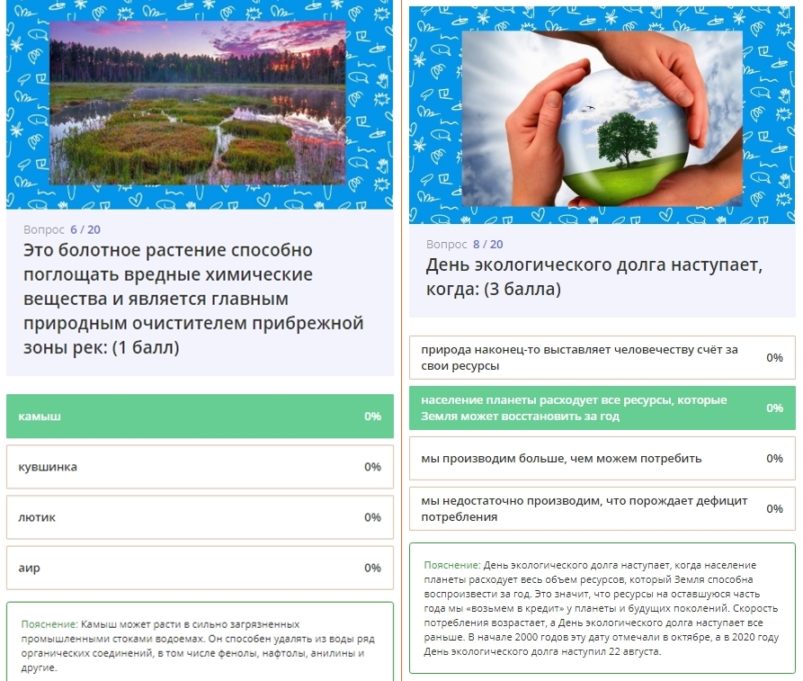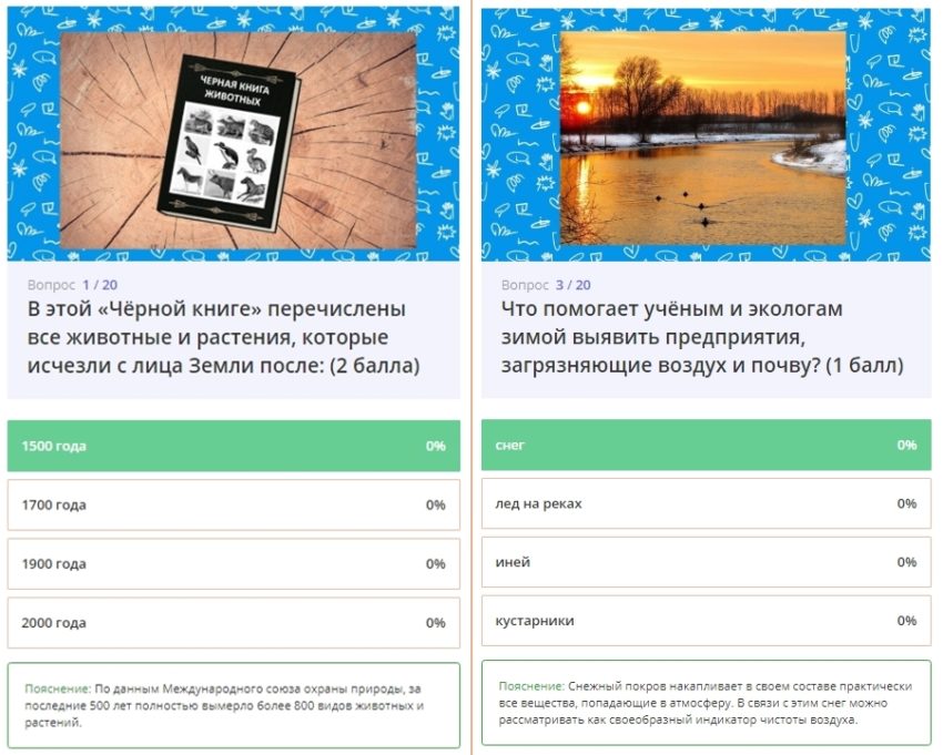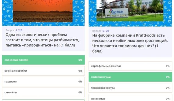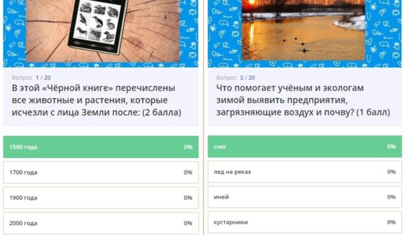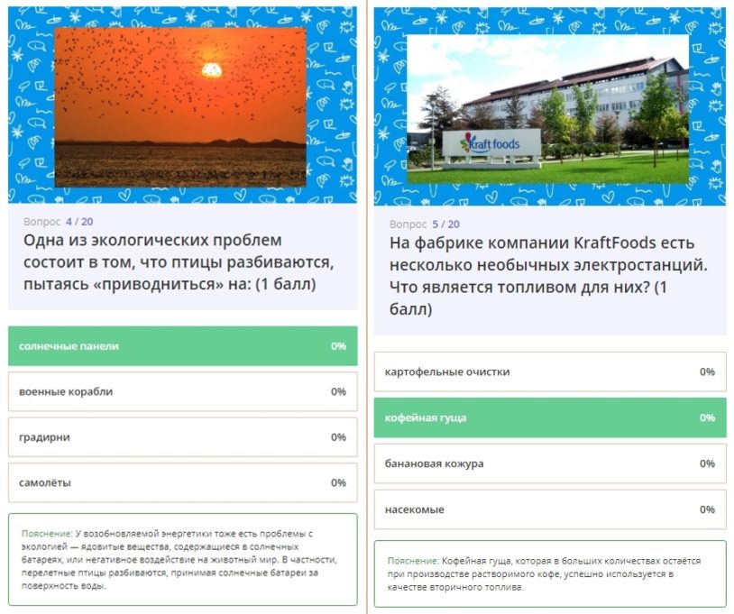 Участники квиза должны были ответить, что помогает учёным и экологам зимой выявить предприятия, загрязняющие воздух и почву, что является топливом для электростанций фабрики KraftFoods, какое болотное растение является главным природным очистителем прибрежной зоны рек.