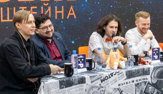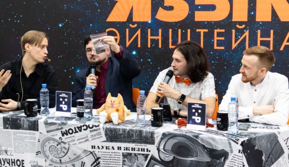 После лекции гости ИЦАЭ Томска приняли участие в научно-популярном ток-шоу «Язык Эйнштейна», в ходе которого эксперты из разных областей знания рассказали последние новости из мира науки. В роли модератора обсуждения выступил резидент стендап-клуба «Томедия» Митя Митькин. Благодаря ему обсуждение сложных новостей оказалось лёгким, понятным и смешным.