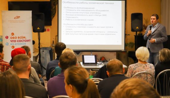 Александр рассказал слушателям о системах электропитания космических аппаратов и о том, как ядерная энергия применяется в космосе. В пример был приведён марсоход Curiosity, который питается от радиоизотопного термоэлектрического генератора (РИТЭГ), как и многие другие аппараты и спутники. «Когда я готовился к лекции, то был приятно удивлён, что прибор и радиопрепарат для него были созданы здесь, в Димитровграде, в частности, для марсохода Curiosity был создан спектрометр», — подчеркнул спикер. Рентгеновский спектрометр APXS на основе кюрия-244 был спроектирован и создан отделением радионуклидных источников и препаратов НИИ атомных реакторов.