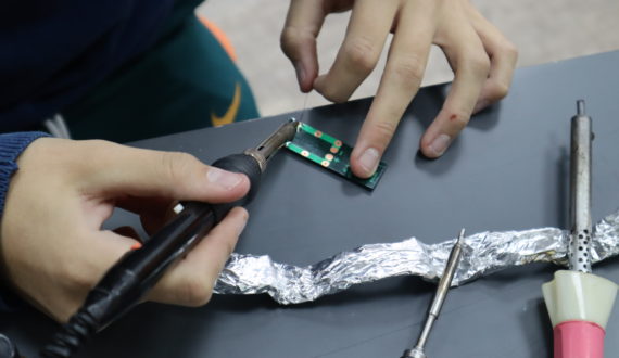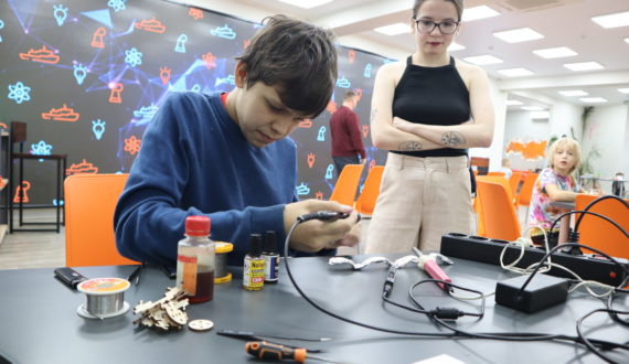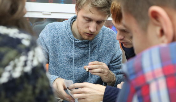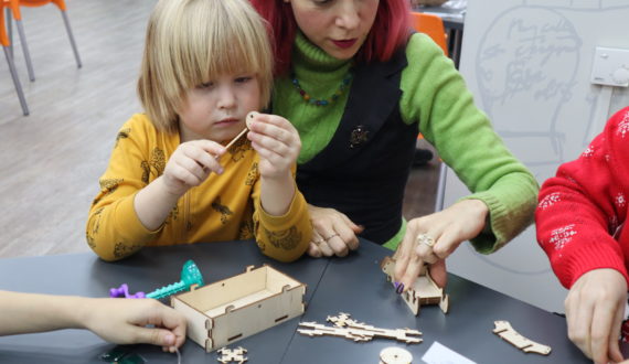 В начале вечера гости ИЦАЭ почувствовали себя сотрудниками настоящего конструкторского бюро. Или почти настоящего. Наборы «Знаток» знакомы многим посетителям центра, особенно по «Атомным практикумам». Начинающие инженеры смогли собрать больше, чем простую электрическую цепь, включили в конструкцию все элементы из набора и измерили эффективность получившегося устройства.