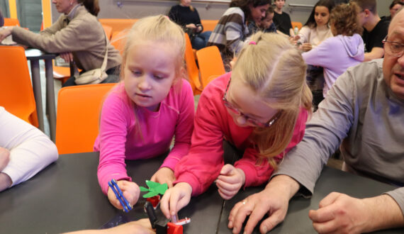 На познавательной интерактивной лекции «Где рождается электроэнергия?» юные и взрослые участники проследили захватывающий путь электроэнергии от электростанции до розетки, а затем с помощью специального набора своими руками зажгли лампочку, превратив механическую энергию вращения в электроэнергию. Также ребята узнали, где рождается самая долгая цепная реакция, и запустили её миниатюрную версию, сделанную из костяшек домино.