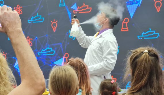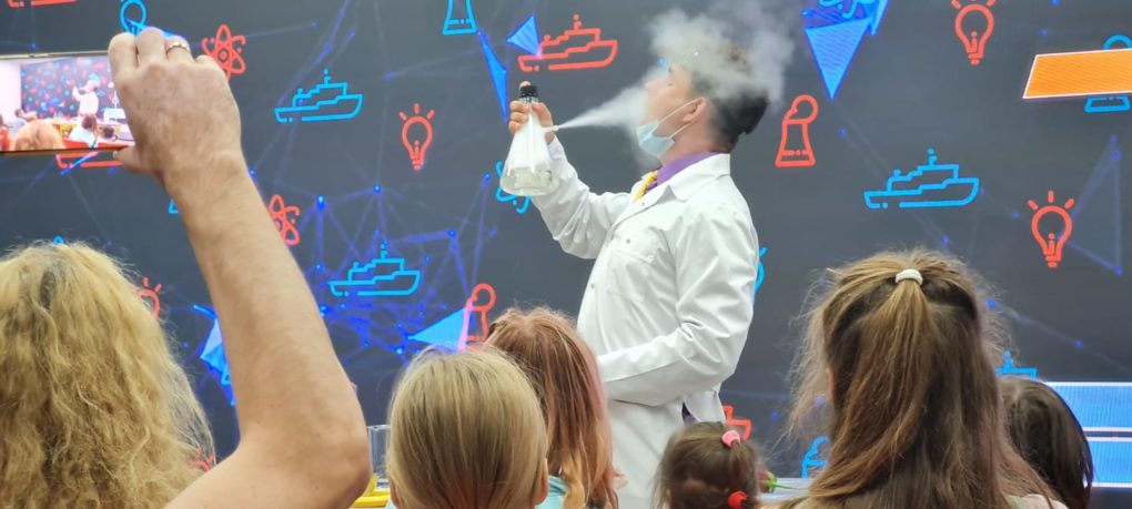 Гвоздём праздника стало захватывающее научное «Шоу профессора Антонио». Зрители увидели, как жидкости меняют цвет, а розы рассыпаются под воздействием азота. Ребята разгадывали тайну синего цвета, смешивая несколько реактивов, держали на ладони огонь и запускали генератор Теслы.