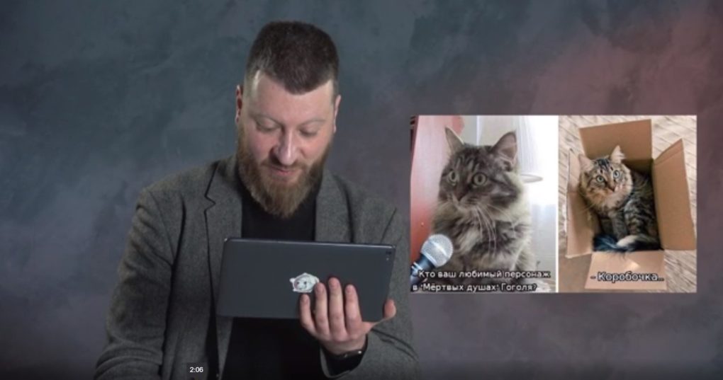 Не обошли стороной в выпуске и тему «котиков» и их пристрастия к коробочкам, тем более что существует немало мемов, связывающих этих милых животных и помещицу Коробочку, героиню поэмы Николая Гоголя «Мертвые души».