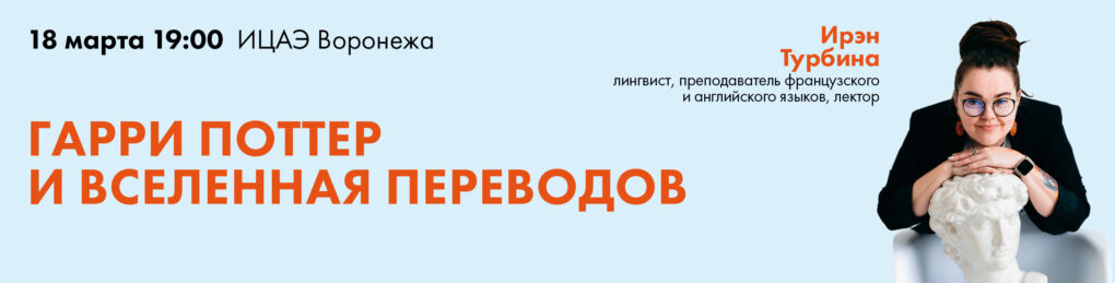 В 19:00 лингвист, преподаватель французского и английского, лектор, автор образовательного ТГ-канала «Трём за языки» Ирэн Турбина прочтёт для гостей ИЦАЭ Воронежа лекцию на тему «Гарри Поттер и Вселенная переводов». Спикер расскажет о трудностях перевода, блестящих (или нет) находках переводчиков, и о том, почему важно читать книги в оригинале.