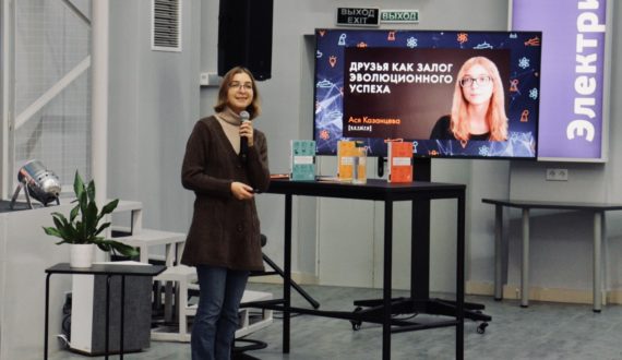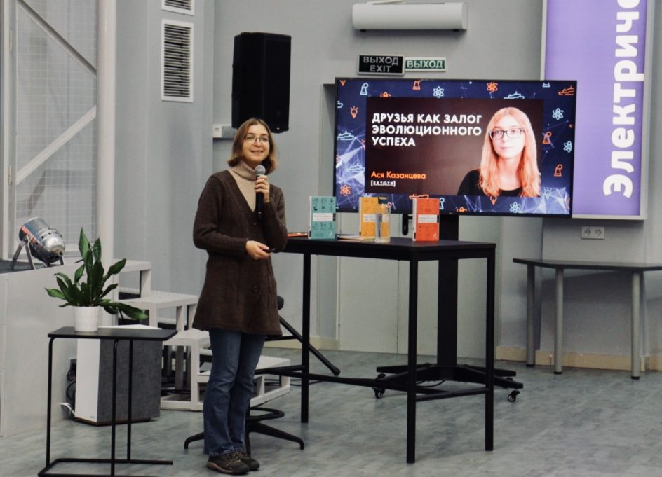 После церемонии началась лекция «Зачем нужны друзья? Долгосрочное партнерство как залог эволюционного успеха» Аси Казанцевой – нейробиолога, известного научного журналиста, лауреата премии «Просветитель», автора трех книг- бестселлеров об иррациональном человеческом поведении.
